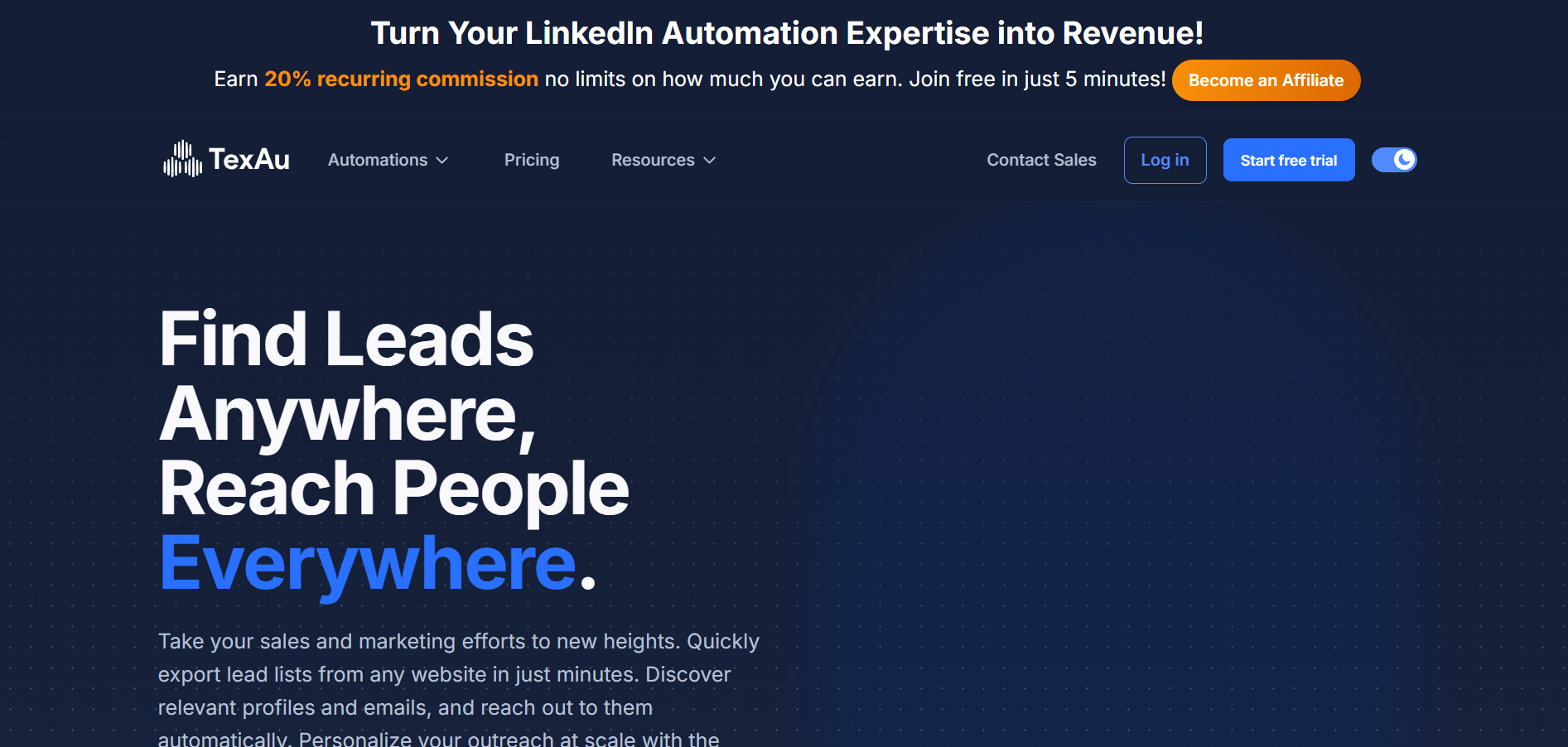 TexAu combines lead scraping with social media automation features, offering "robots" that can extract contacts and automate outreach across multiple platforms.